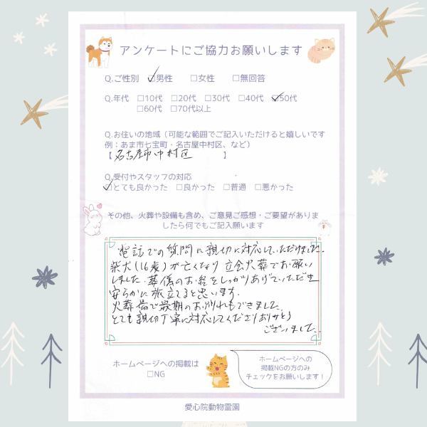 柴犬(16歳)が亡くなり立会火葬でお願い